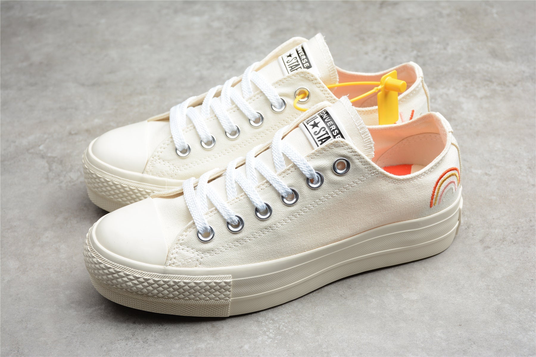 As Converse Chuck Taylor All Star Rainbow Platform Low em branco creme elevam o estilo clássico com um toque moderno e alegre. Confeccionadas em lona premium, mantêm o design icónico de perfil baixo com uma sola de plataforma que acrescenta altura extra sem comprometer o conforto. A sua construção robusta e as costuras reforçadas garantem durabilidade, enquanto o delicado bordado de arco-íris no calcanhar adiciona uma nota de cor e otimismo. Ideais para quem procura um visual casual com personalidade e um toque distintivo que combina na perfeição com qualquer outfit urbano ou descontraído.